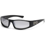 Sej smal solbrille i mat sort stel. Fede store LOCS metal logoer på stængerne.