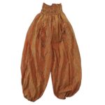 Da sarierne som bukserne er produceret af, er genbrugte, kan vi ikke garantere den præcise sammensætning af materialet i hver enkelt par bukser. De fleste indeholder en del mængde silke og ofte 100%, men kan også indeholde syntetiske fibre og være en blanding. Selvom vi foretrækker at undgå kunststoffer, mener vi stadig, at genbrugte sarier er et bæredygtigt valg, da stoffet får nyt liv i stedet for at gå til spilde.
